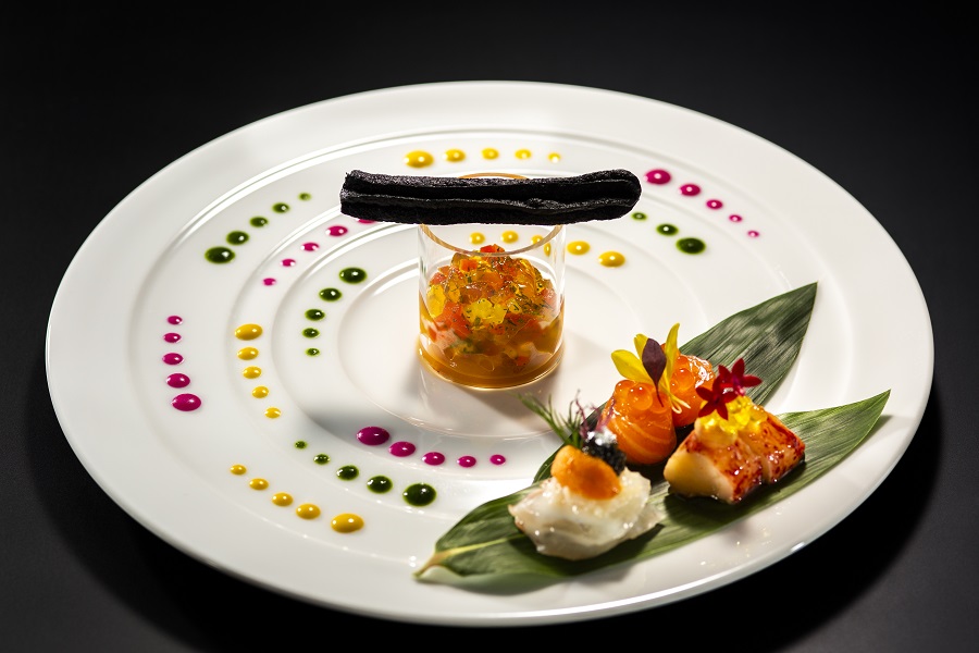 オマール海老、熟成真鯛、薪で燻したサーモン、黒いチュロスと共に
