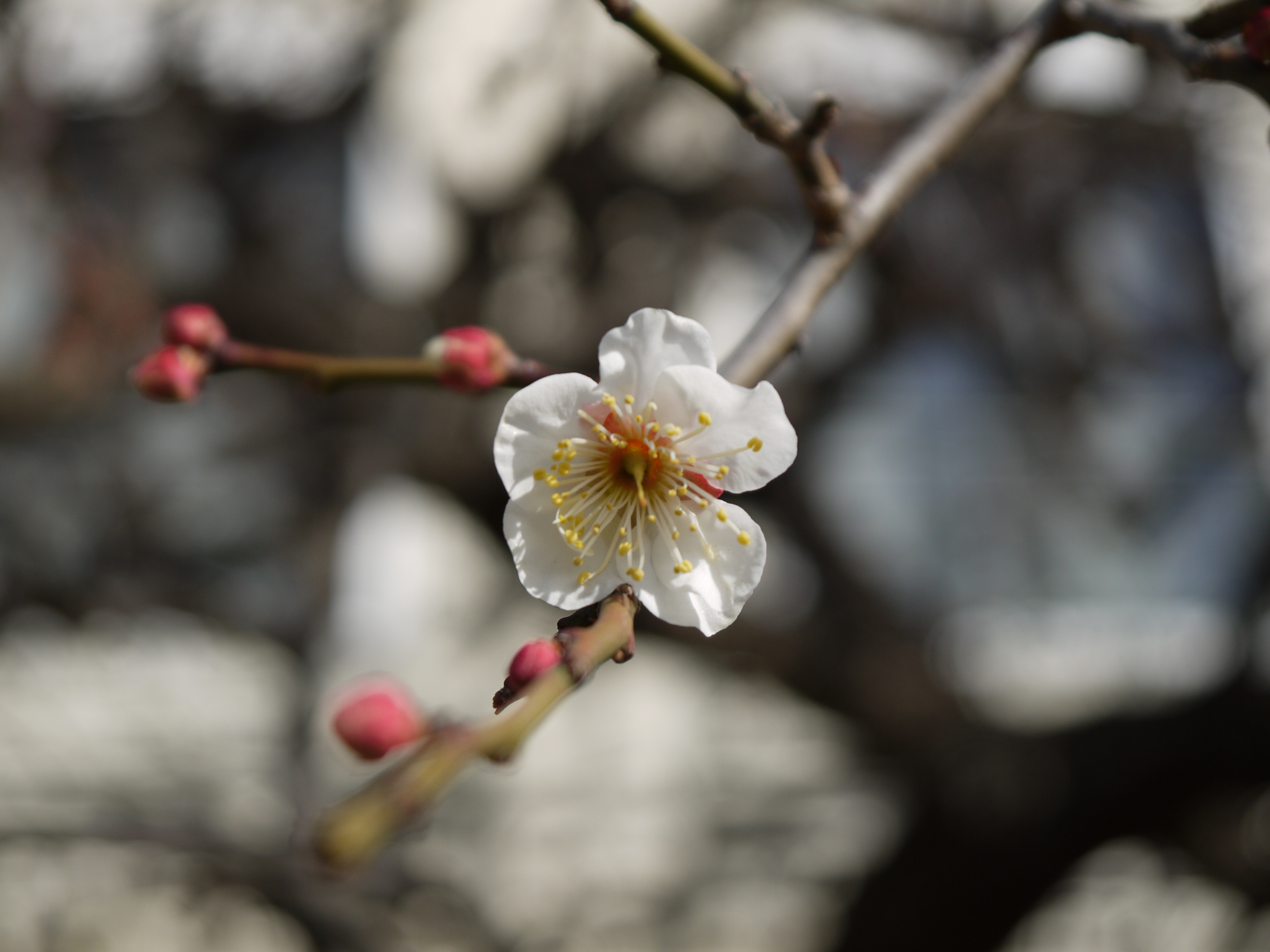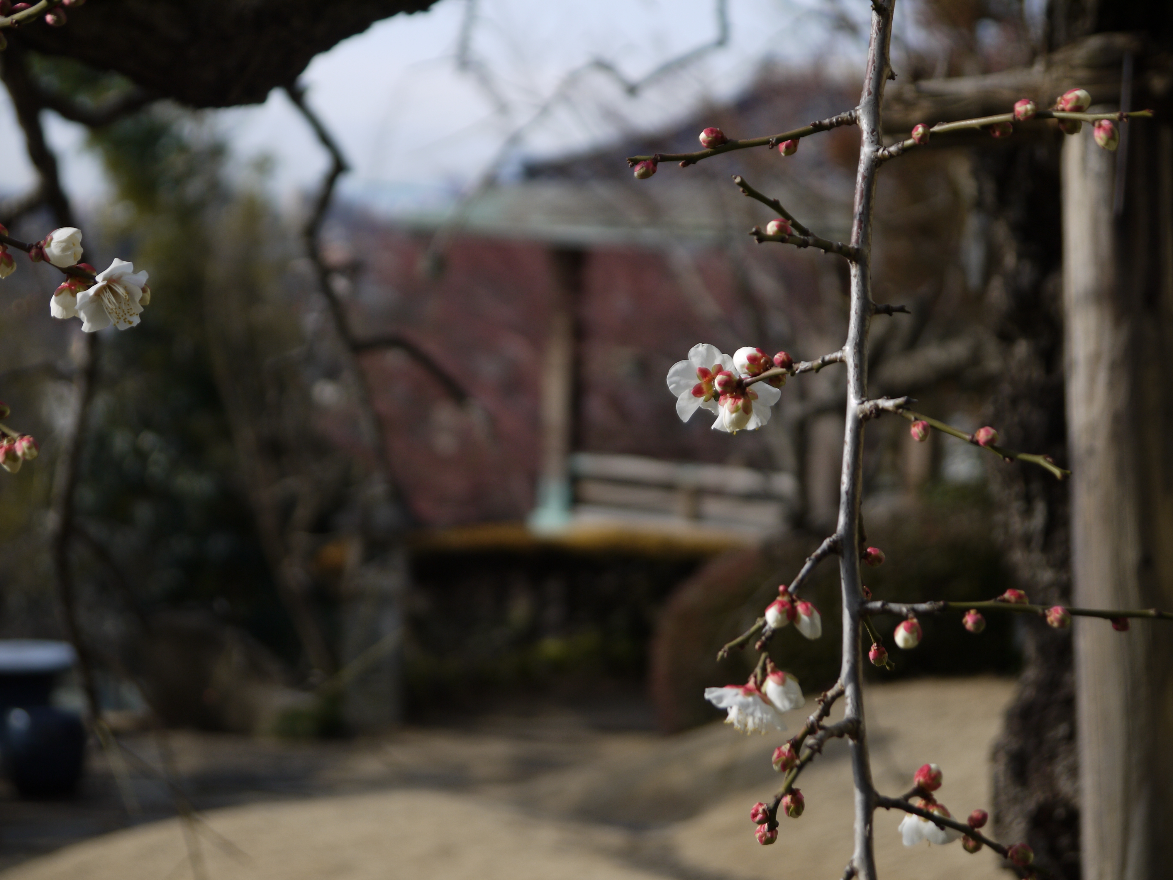 庭園の枝垂れ梅が開花してまいりました。
