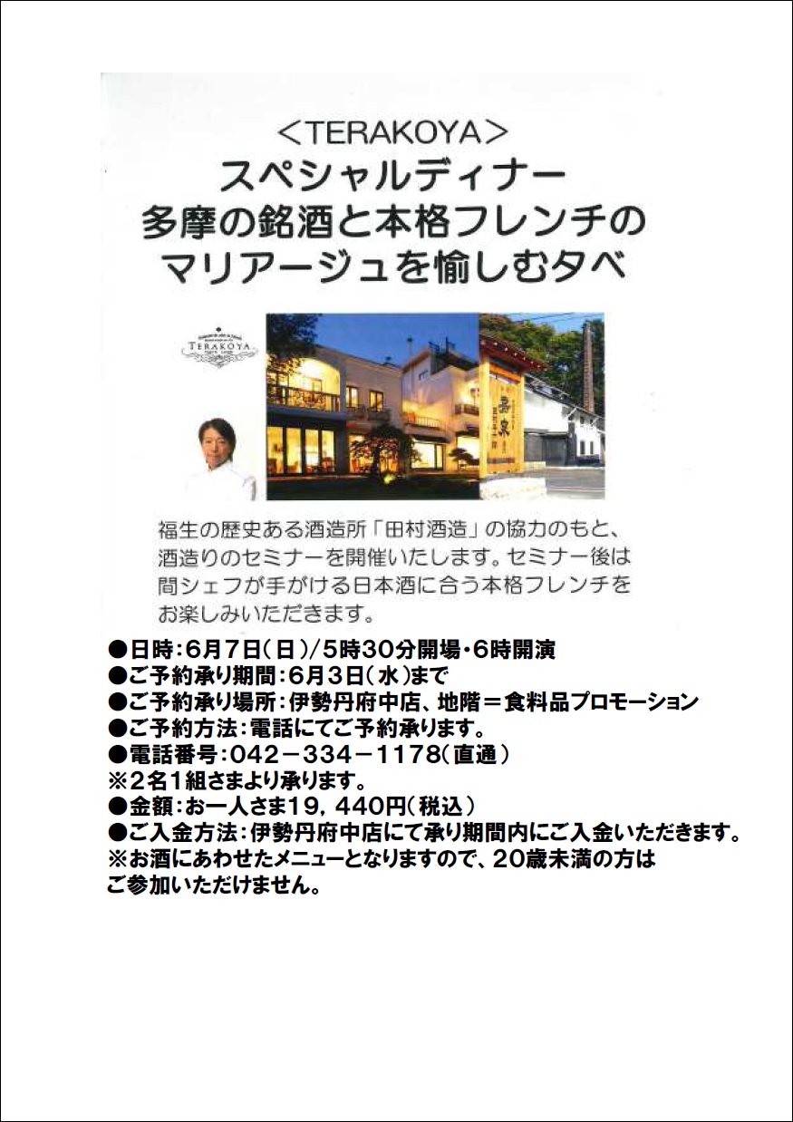 6月7日(日) 田村酒造・伊勢丹府中店・TERAKOYAのコラボディナーが...